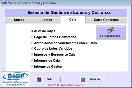 A partir de la carga de los Datos de los Loteos y de los de su posterior Venta el sistema permitirá el Seguimiento y Gestión de las Cobranzas y de la Cuenta Corriente de Participación de los Socios, con informes Particulares y Consolidados de los Loteos y de Movimientos de Caja.